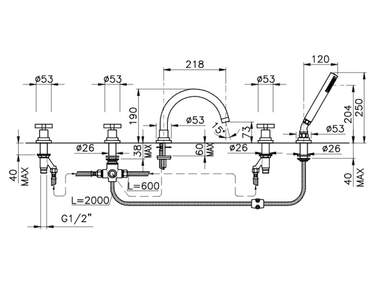 Модель имеет округлую форму с вентильным управлением и предназначена для монтажа на пять отверстий на борт ванны, материал изготовления сантехническая латунь.
