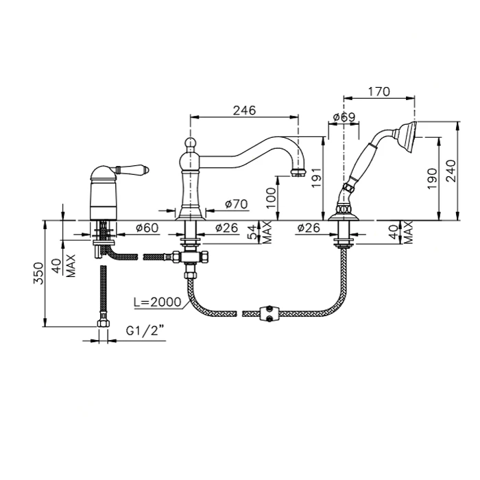 Смеситель на борт ванны 3 отверстия, с изливом 200мм и ручным душем, ручки белая керамика, цвет: хром, серия Petit Mont Blanc. Rubinetteria Nicolazzi spa – одна из известнейших итальянских фабрик, специализирующихся на производстве смесительного оборудования и аксессуаров для ванных комнат класса «люкс».