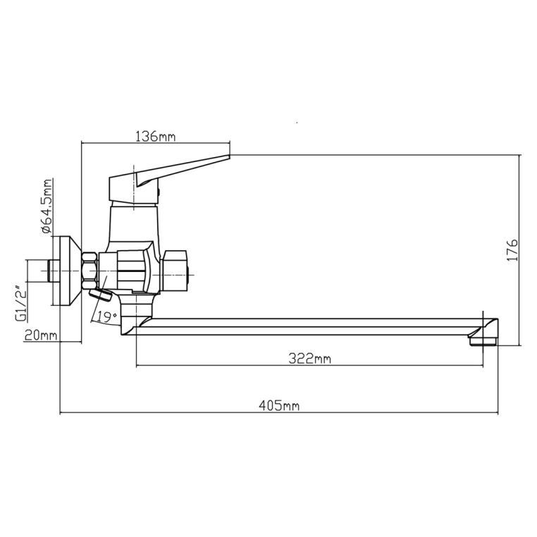 Смеситель для ванны с изливом Z формы 322мм., металлический шланг 1,5 м, душевая лейка диаметром 68 мм, пластиковый держатель на 2 положения