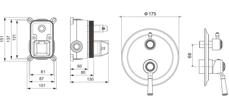 Смеситель из латуни с установочной коробкой на 2 потребителя