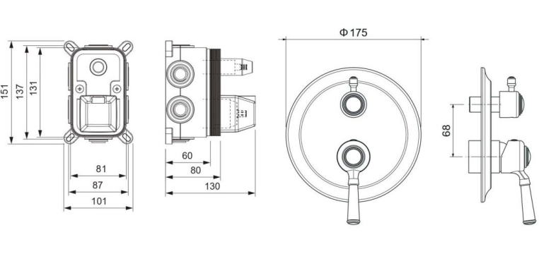 Смеситель из латуни с установочной коробкой на 3 потребителя