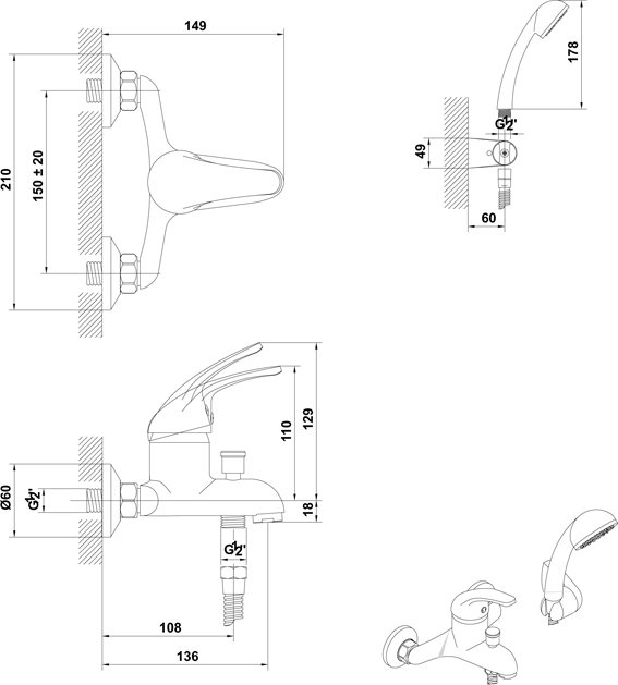 Однорычажный смеситель для ванны и ручным душем Alea.