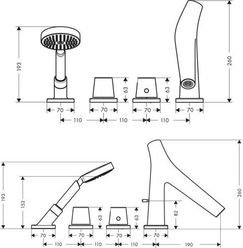 - комплект поставки: рукоятки, термостатический картридж, запорный вентиль, излив на ванну с переключателем