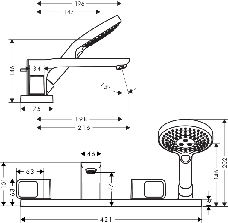 - комплект поставки: рукоятки, излив на ванну, ручной душ Raindance S