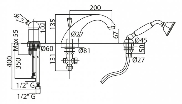 Смеситель на борт ванны с выдвижным душем Cezares Vintage VINTAGE-BVDM-01-Sw хром