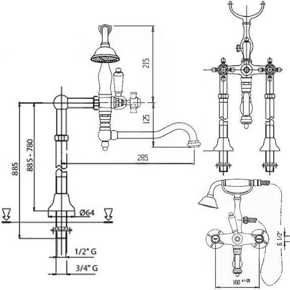 Хромированный напольный смеситель для ванны в ретро стилистики с хромированными ручками.