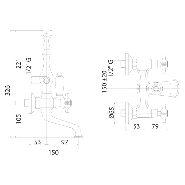 Хромированный вентильный смеситель в ретро стилистике для борта ванны с душем и фиксированным изливом. Ручки переключателя и душа хромированные.