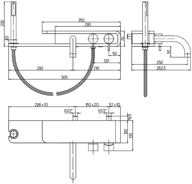В комплекте поставки смеситель, душевая лейка, душевой шланг.