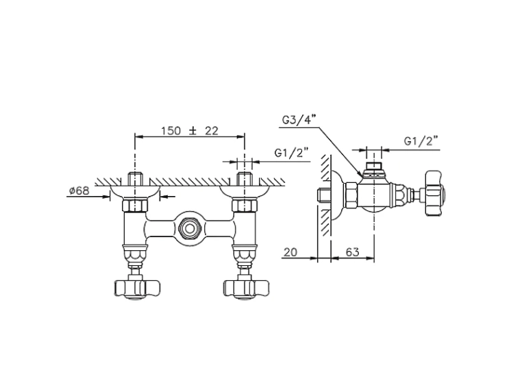 Модель имеет округлую форму с вентильным управлением и предназначена для монтажа на два отверстия на стену, материал изготовления сантехническая латунь.
