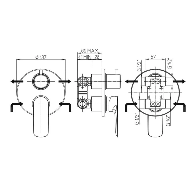 • Встраиваемый монтаж скрывает все соединения и оставляет на виду только рычаг управления, что добавляет в интерьер дизайнерский акцент, экономя пространство.
