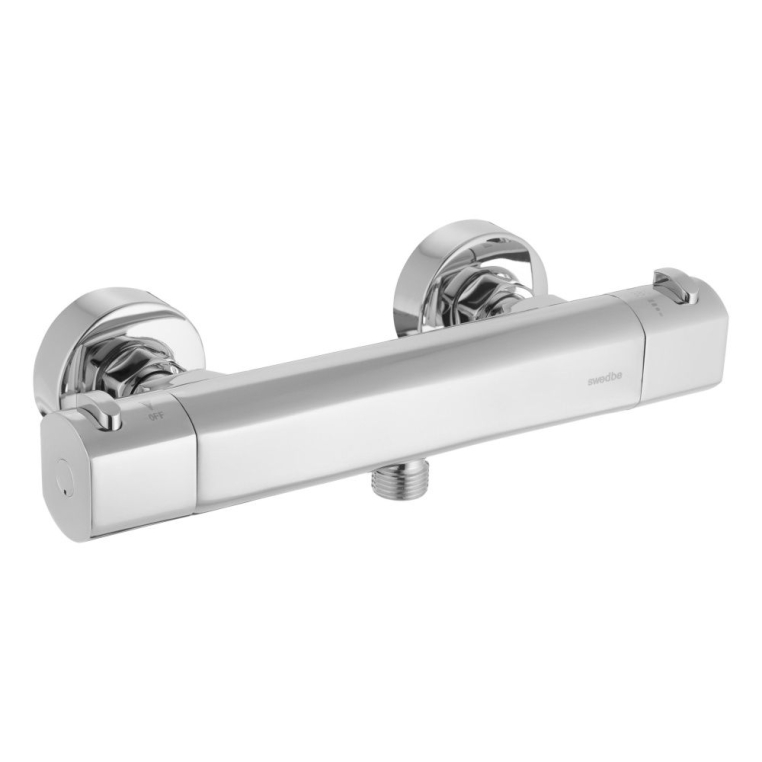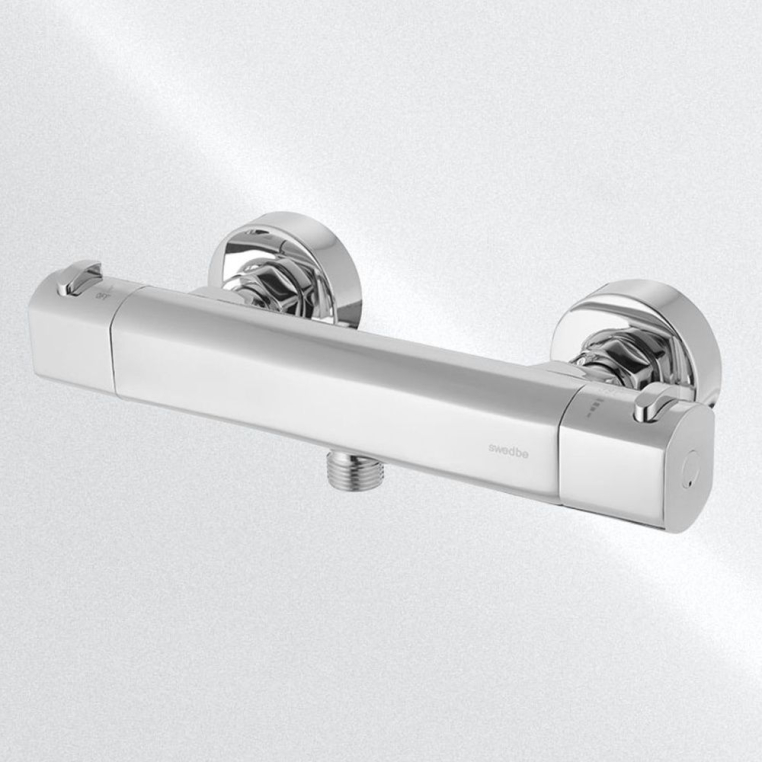 Термостат для душа Swedbe Mercury — надёжный смеситель от шведского бренда Swedbe. Оснащён «умным» картриджем. Благодаря обратным клапанам решается проблема «выдавливания» холодной воды горячей из-за разницы давления, когда температуру воды отрегулировать невозможно. Клапаны чётко разделяют холодную и горячую воду, исключая подмес. Это важно в тех домах, где есть сильная разница давления в стояках. В моделе предусмотрен ограничитель температуры, предустановленный на отметке 38 градусов, что считается идеальным значением для комфортного мытья. Можно не бояться обжечься при повороте рукоятки температуры, что актуально для семей с маленькими детьми.