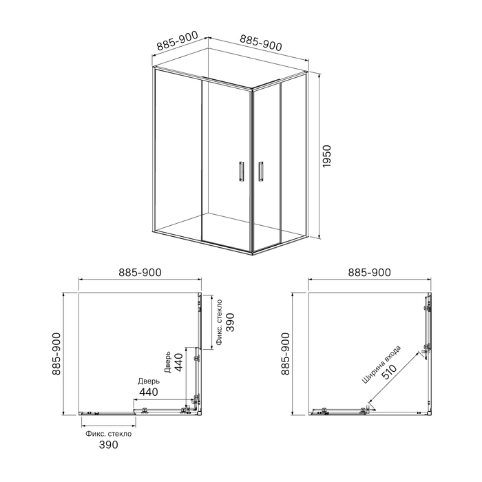 Душевое ограждение для ванной комнаты Zodiac квадратной формы с регулируемым размером 885-900х885-900х1950 мм, что позволяет сгладить неровности стен до 15 мм.