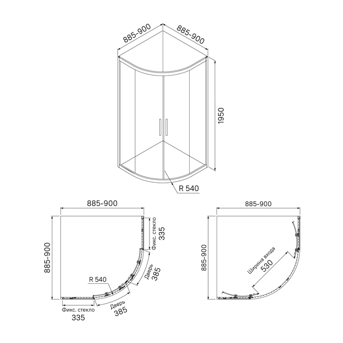 Душевое ограждение для ванной комнаты Zodiac в форме четверти круга с регулируемым размером 885-900х885-900х1950 мм, что позволяет сгладить неровности стен до 15 мм.