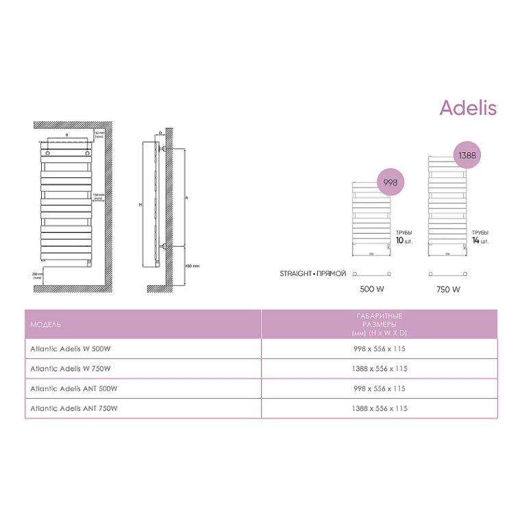 Электрополотенцесушитель Atlantic Adelis — технологичная модель полотенцесушителей, выполненная в двух цветах: белый и антрацит. Устройство можно использовать в любое время, просто подключив его к электричеству. Оборудование используется как для сушки полотенец, так и для прогрева помещения, для этого предусмотрены различные режимы работы. Полотенцесушитель в ванной позволяет равномерно прогревать помещение и уменьшать уровень влажности, что предотвращает появление грибка и плесени на стенах. Устанавливать оборудование рекомендуется в ванных комнатах квартир или частных домов на высоте не менее 20 см от пола и на расстоянии не менее 15 см от стен, потолка и мебели. Соблюдение этих норм значительно повышает эффективность прогрева помещения.