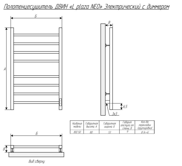 Полотенцесушитель ДВИН L plaza neo 80/50 Электрический (К диммер квадрат Чёрный матовый)