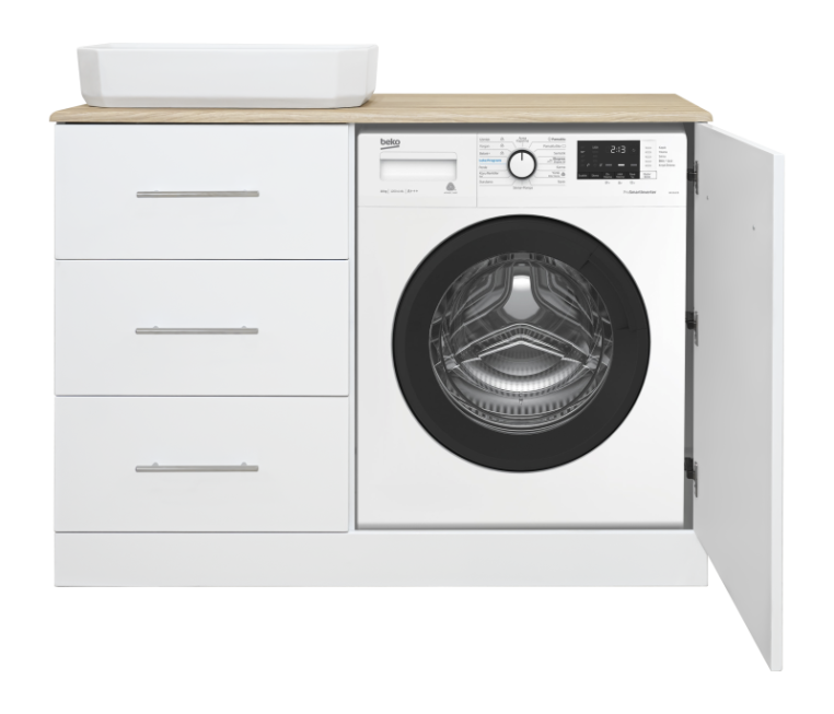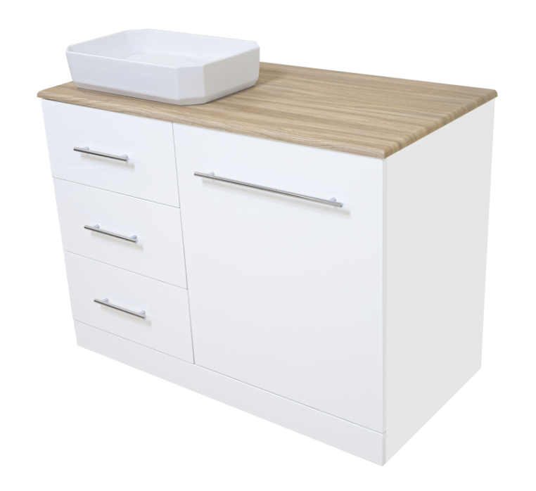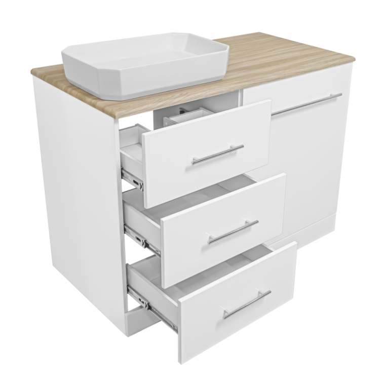 Коллекция Респект представлена тумбами под раковину и зеркальными шкафами. Конструкция тумбы включает в себя три выдвижных ящика и большое отделение, которое поможет спрятать стиральную машину, чтобы не нарушать дизайн ванной комнаты. На выбор пользователя, расположение ящиков может быть слева или справа. В зависимости от модели тумбы, отделение для стиральной машины закрывается распашным фасадом или дверью- купе. В отличие от большинства аналогов, здесь нет места для встроенного умывальника, что позволяет установить на столешницу любую накладную раковину на свой вкус.