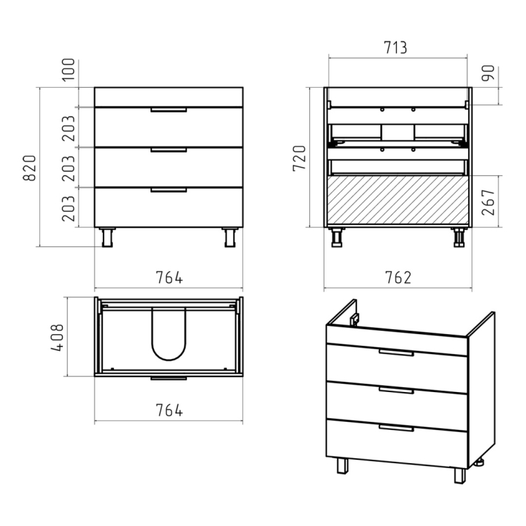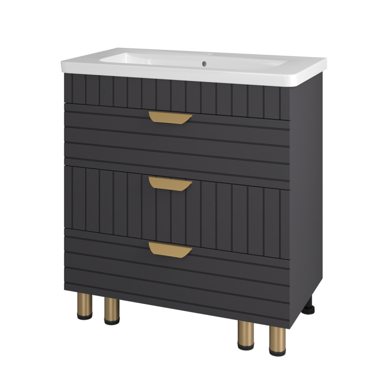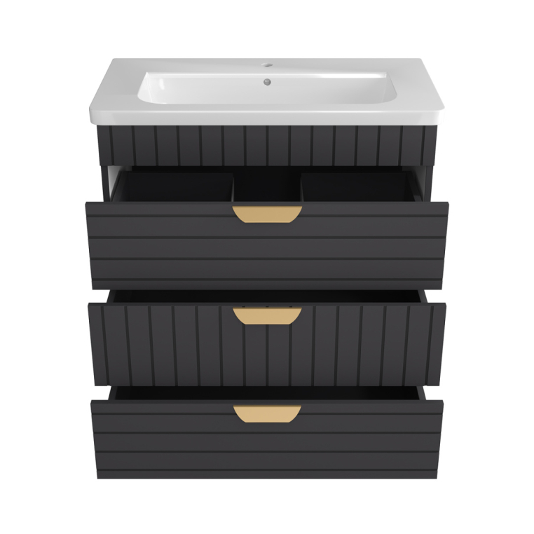 Тумбы под умывальник Бревита Глостер выпускаются в трех популярных типоразмерах – 60, 70 и 80 см ширины. Вне зависимости от габаритов, каждая тумба оснащена тремя выдвижными ящиками с доводчиком на направляющих скрытого монтажа.