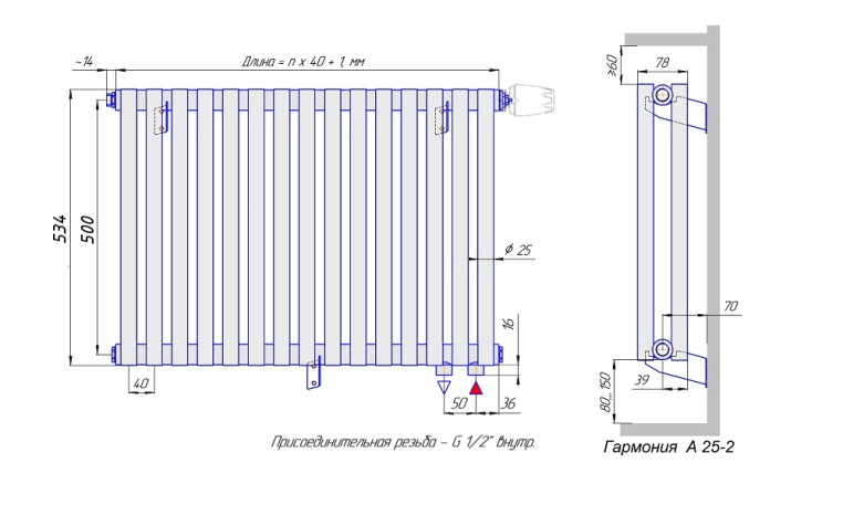 Стальной трубчатый радиатор КЗТО Гармония А25-2 500 / 52 секции с нижней подводкой (Гармония А25 2-500-52 нп)