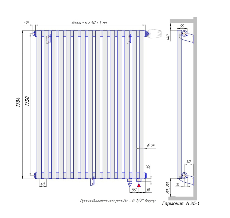 Стальной трубчатый радиатор КЗТО Гармония А25-1 1750 / 30 секций с нижней правой подводкой (Гармония А25 1-1750-30 нп прав)