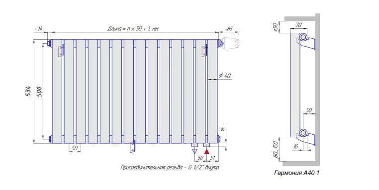 Стальной трубчатый радиатор КЗТО Гармония А40-1 500 / 34 секции с нижней правой подводкой (Гармония А40 1-500-34 нп прав)