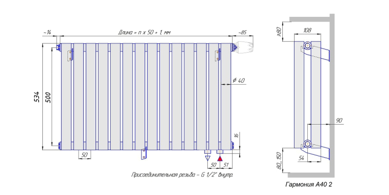 Стальной трубчатый радиатор КЗТО Гармония А40-2 500 / 39 секций с нижней подводкой (Гармония А40 2-500-39 нп)
