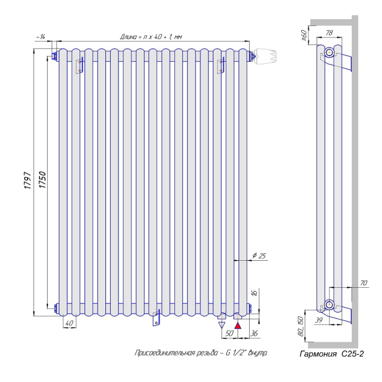 Стальной трубчатый радиатор КЗТО Гармония С25-2 1750 / 08 секций с нижней подводкой (Гармония С25 2-1750-8 нп)