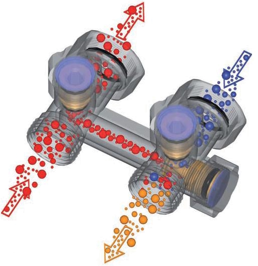 M 174 - распределители для однотрубных и двухтрубных систем медных и пластиковых труб, с двойным уплотнением. Напольное подсоединение типа евроконус G3/4. Угловой блок.