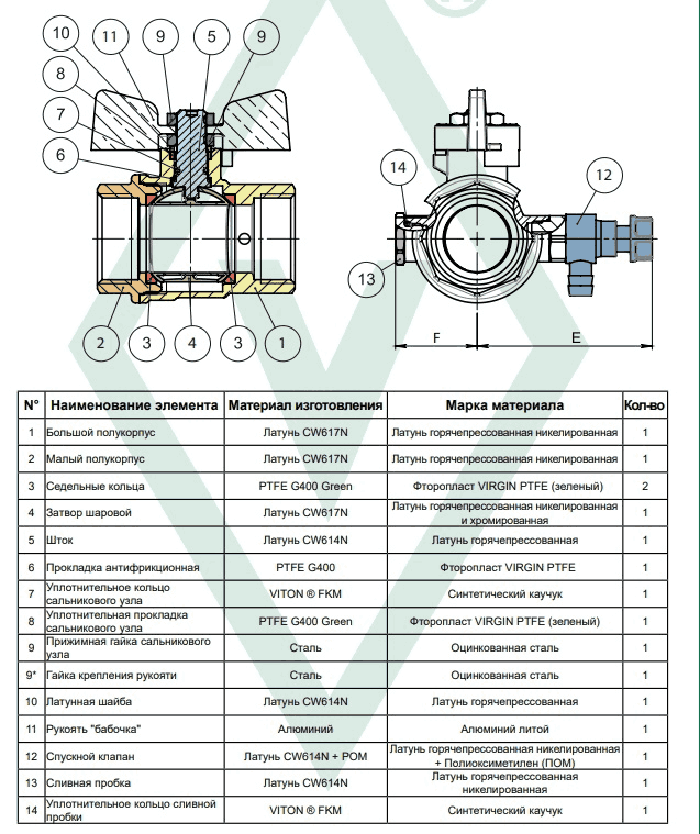 - Материал шара и штока: латунь