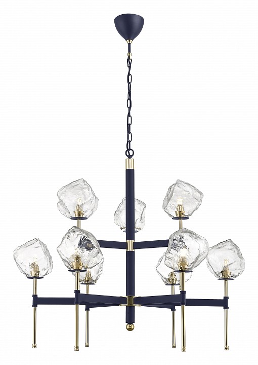Двухярусная люстра из металла окрашенного в матовый синий цвет с золотыми элементами и плафонами в виде прозрачных глыб льда. D660mm, H850-2310mm, 9хG9