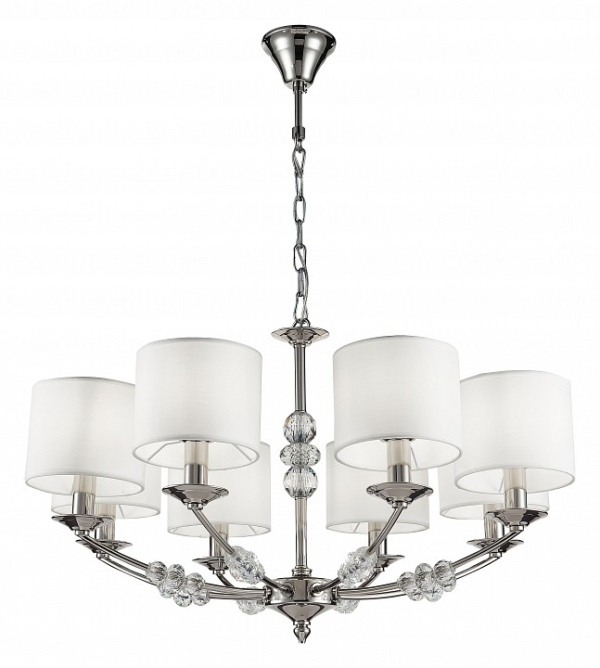 Люстра из металла цвета глянцевый никель, с цилиндрическими тканевыми абажурами и небольшими декоративными элементами из граненого стекла. 8хЕ14
