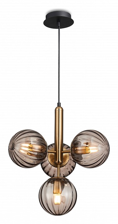 Подвес с черной потолочной чашей и черным проводом, металлическим продолговатым элементом цвета бронзы и 4-мя плафонами из дымчатого стекла. D310mm, H500-1900mm, 4хЕ27