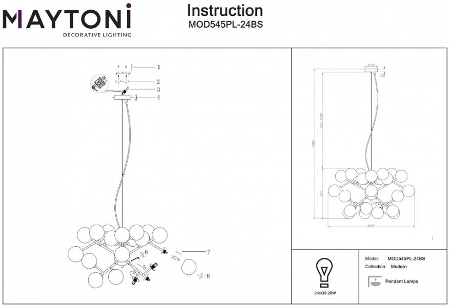 Изделие MOD545PL-24BS от немецкого бренда Maytoni относится к коллекции Modern и отлично подойдет для установки на потолок в гостиной, оформленной в стиле модерн. Подвесная люстра Maytoni Dallas MOD545PL-24BS с плафонами в виде шаров осветит помещение площадью 84 кв.м. Для устройства рекомендуется использовать галогеновые лампы с цоколем G9 и мощностью 28 W. Основными материалами для производства используется металл и стекло и может использоваться для натяжного потолка. Преимущественно представляется в цвете Золотой и Матовый белый.