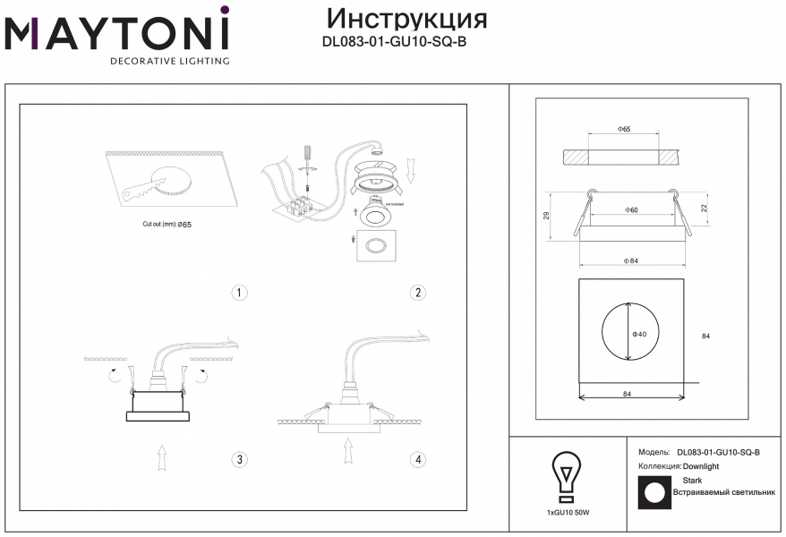 Цоколь GU10 с максимальной мощностью лампы 50 Вт в который подойдут лампы типа галогеновая или светодиодная LED. Материал арматуры: алюминий.