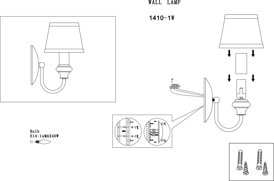 Цоколь E14 с максимальной мощностью лампы 40 Вт в который подойдут лампы типа накаливания или светодиодная (LED). Плафоны состоят из таких материалов, как рогожка. Материал арматуры: керамика, металл.
