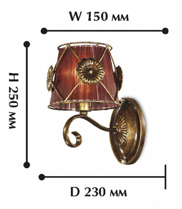 Форма плафона конус, цвет плафона коричнево-бордовый, цвет арматуры бронза окрашенная. Лампы в комплекте: отсутствуют. Светильник имеет слабую защиту от влаги и пыли — IP20 и предназначен для использования в домашних интерьерах с умеренной влажностью.