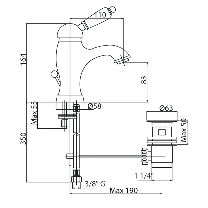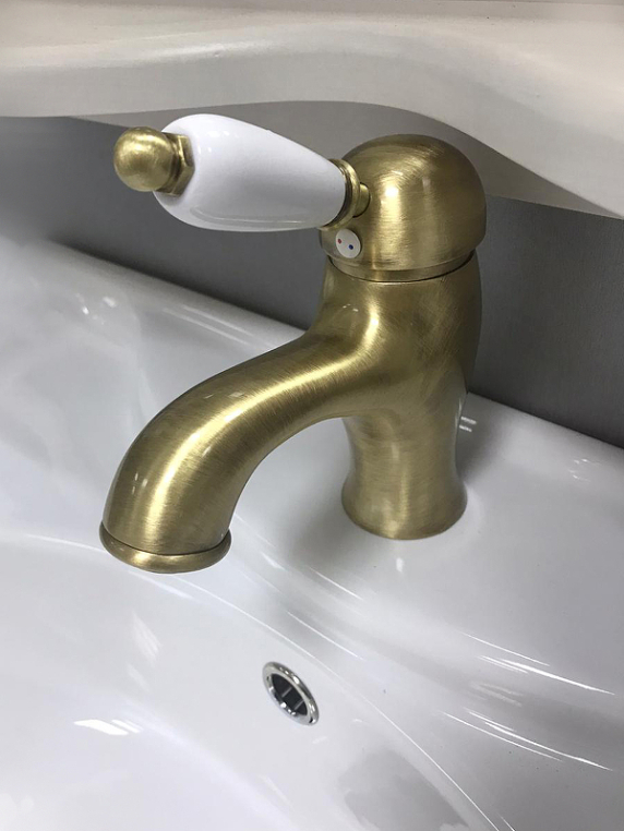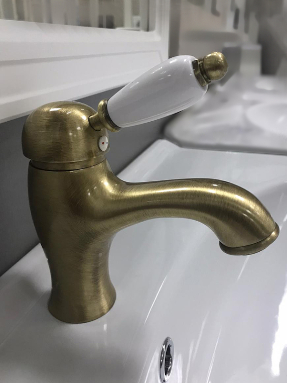 Смеситель на раковину в классическом стиле с бронзовым покрытием. Ручка белая. Смеситель оснащается аэратором и донным клапаном.