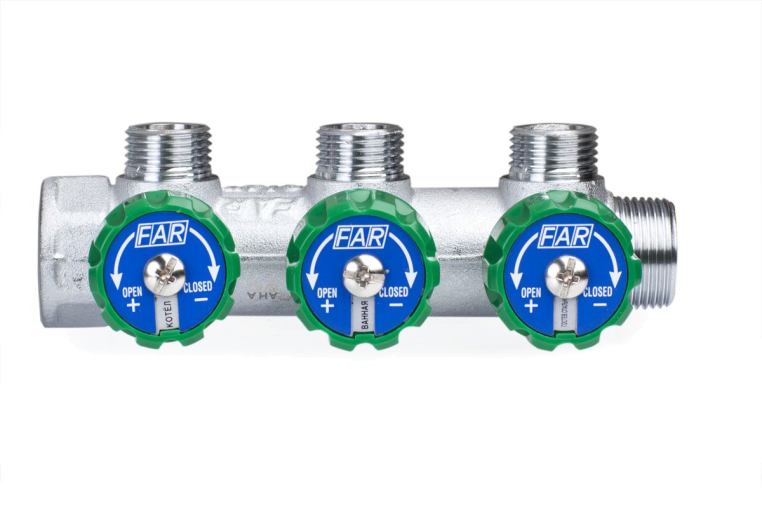 Коллекторы FAR со встроенными регулирующими и запорно-балансировочными вентилями. С помощью расположенной на передней поверхности коллектора управляющей ручки вентиля и закрывающегося колпачка отсекателя, пользователь может легко обслуживать систему без каких-либо дополнительных инструментов.