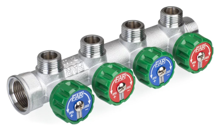 Коллекторы FAR со встроенными регулирующими и запорно-балансировочными вентилями. С помощью расположенной на передней поверхности коллектора управляющей ручки вентиля и закрывающегося колпачка отсекателя, пользователь может легко обслуживать систему без каких-либо дополнительных инструментов.
