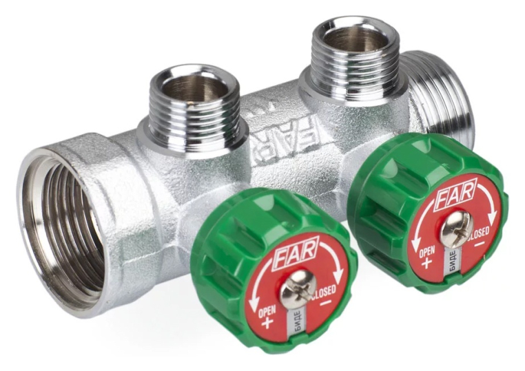 Коллекторы FAR со встроенными регулирующими и запорно-балансировочными вентилями. С помощью расположенной на передней поверхности коллектора управляющей ручки вентиля и закрывающегося колпачка отсекателя, пользователь может легко обслуживать систему без каких-либо дополнительных инструментов.
