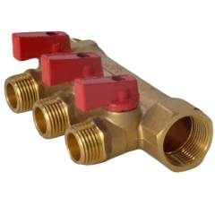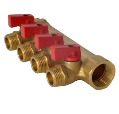 Коллектор латунь 3/4" ВР/НР на 4 вых 1/2" НР м/о 35мм с шаровыми кранами, красные ручки 9026 Aquasfera 9026-03