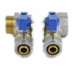 Коллектор латунь 1" ВР/НР на 2 вых Дн16 м/о 35мм обжим с шаровыми кранами, синие ручки для мп 7015 Aquasfera 7015-03