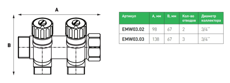 Коллектор модульный Elsen 3/4 2 выхода 1/2", с вентилями (EMW03.02)