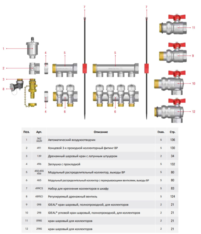 Коллектор оснащен пластиковыми вентилями, которые позволяют регулировать напор воды для каждой точки разводки. Рекомендованный момент затяжки – 40 Нм, максимальный момент затяжки – 60 Нм. Максимальная рабочая температура коллектора +110 оС. Для присоединения к трубопроводу используется наружная / внутренняя резьба HB G 1". Для присоединения контуров отопления применяются отводы с наружной резьбой H диметром G 1/2" х 16 мм с конической посадкой. Резьба: ISO228 (эквивалентно DIN EN ISO 228 и BS EN ISO 228)