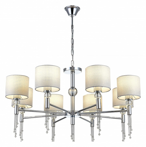 Люстра из металла цвета хром, с серыми абажурами и декоративными цепочками. 8хЕ27