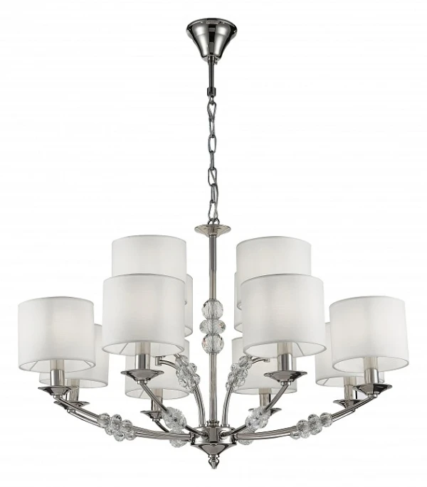 Люстра из металла цвета глянцевый никель, с цилиндрическими тканевыми абажурами и небольшими декоративными элементами из граненого стекла. 12хЕ14