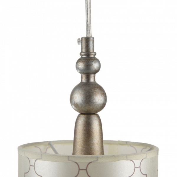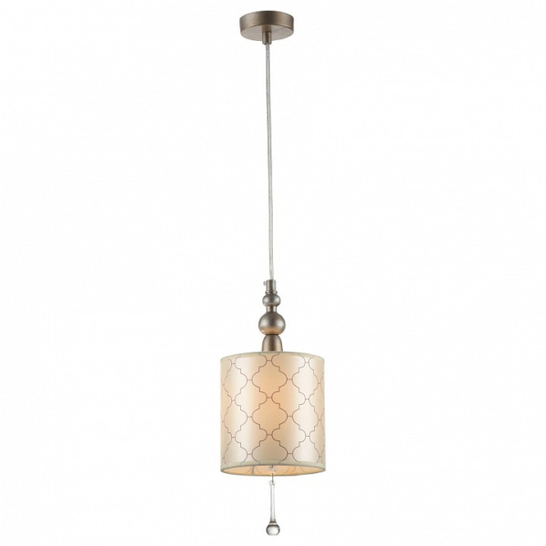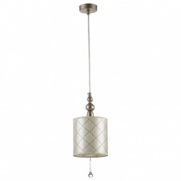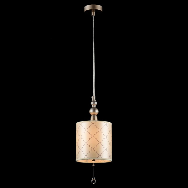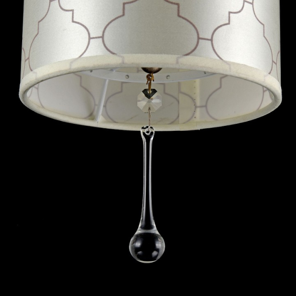 Арматура из металла. Абажур из ПВХ покрыт тканью с узором в стиле ар-деко. Подвески из *хрусталя.