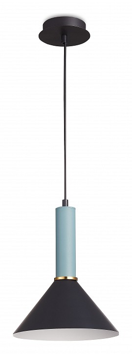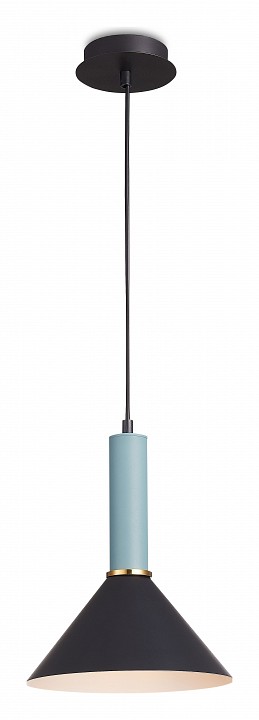 Подвес с черной потолочной чашей и черным проводом, верхней частью голубого цвета и плафоном из металла черного цвета снаружи и белого внутри. Без рассеивателя. D240mm, H325-1825. 1ХЕ27