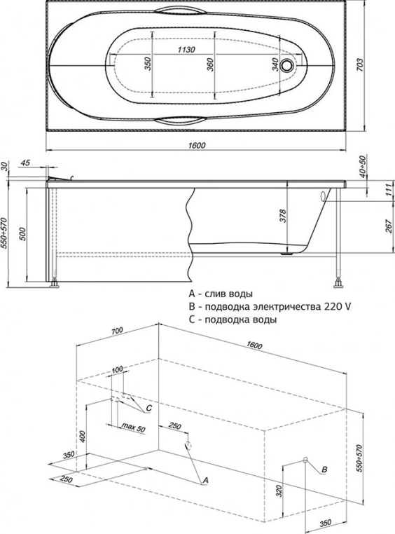 Акриловая ванна Aquanet Dali 160x70 с каркасом 00239384+00239386