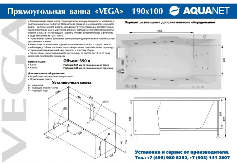 Вместительная акриловая ванна 190х100 Vega станет вашим любимым местом проведения досуга. Увеличенные габариты чаши позволят с комфортом насладиться принятием горячей расслабляющей ванны даже вдвоем, в такой ванной без преувеличения можно почувствовать себя как в бассейне. Прямоугольная форма позволит гармонично вписать эту модель как в классический, так и современный интерьер. Особые свойства акрила делают его идеальным материалом для изготовления ванн: он прочен, прост в уходе, непроницаем для бактерий, легко ремонтируется, поверхность чаши менее скользкая по сравнению с чугунными аналогами. Еще одно важное преимущество акриловой ванны заключается в ее теплоемкости: вода здесь намного дольше остается горячей.