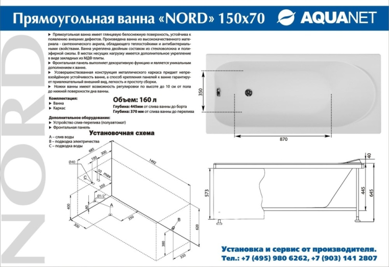 Прямоугольная акриловая ванна Nord подойдет не только ценителям классических форм и решений, но также тем, чьи ванные комнаты имеют небольшую площадь. Простая по форме, эта ванна, однако, имеет все необходимое для комфортного использования: эргономичное строение с рассчитанным углом наклона задней стенки позволит удобно расположиться даже человеку высокого роста, специальный выступ для подголовника обеспечит удержание головы сидящего над поверхностью воды, а компактные площадки по углам ванны предназначены для размещения банных принадлежностей. Особые свойства акрила делают его идеальным материалом для изготовления ванн: он прочен, прост в уходе, непроницаем для бактерий, легко ремонтируется. Еще одно важное преимущество акриловой ванны заключается в ее теплоемкости: вода здесь намного дольше остается горячей.